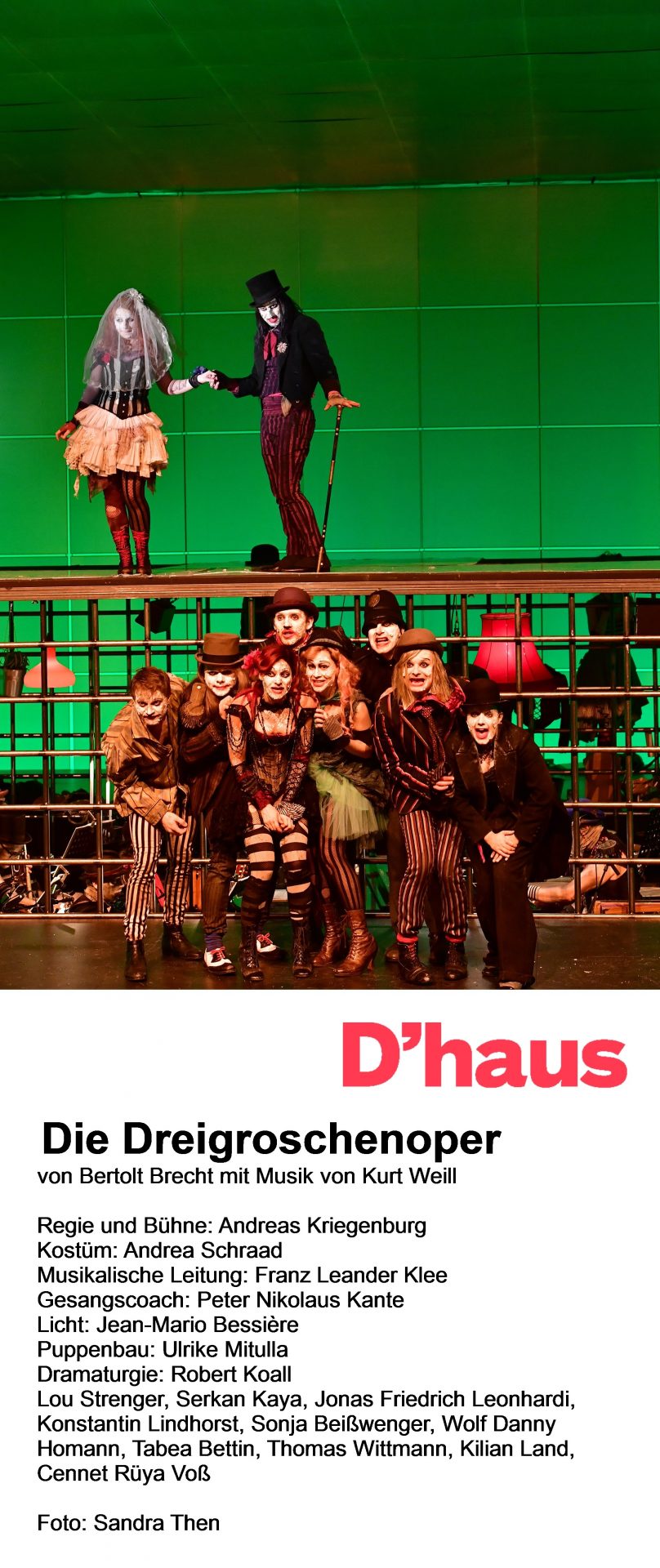 Das gesamte Ensemble steht zur Schlussnummer an der Rampe und schmettert ausdrucksstark und irgendwie bedrohlich „Der Mensch lebt nur von Missetat allein“. Hier endlich flackert das chorische Mahnen auf, welches 1928 durch Bertolt Brechts Libretto und Kurt Weills Musik noch wie ein desillusionierender Schlag ins Gesicht gewirkt haben muss – „…bildet euch da nur nichts ein!“.