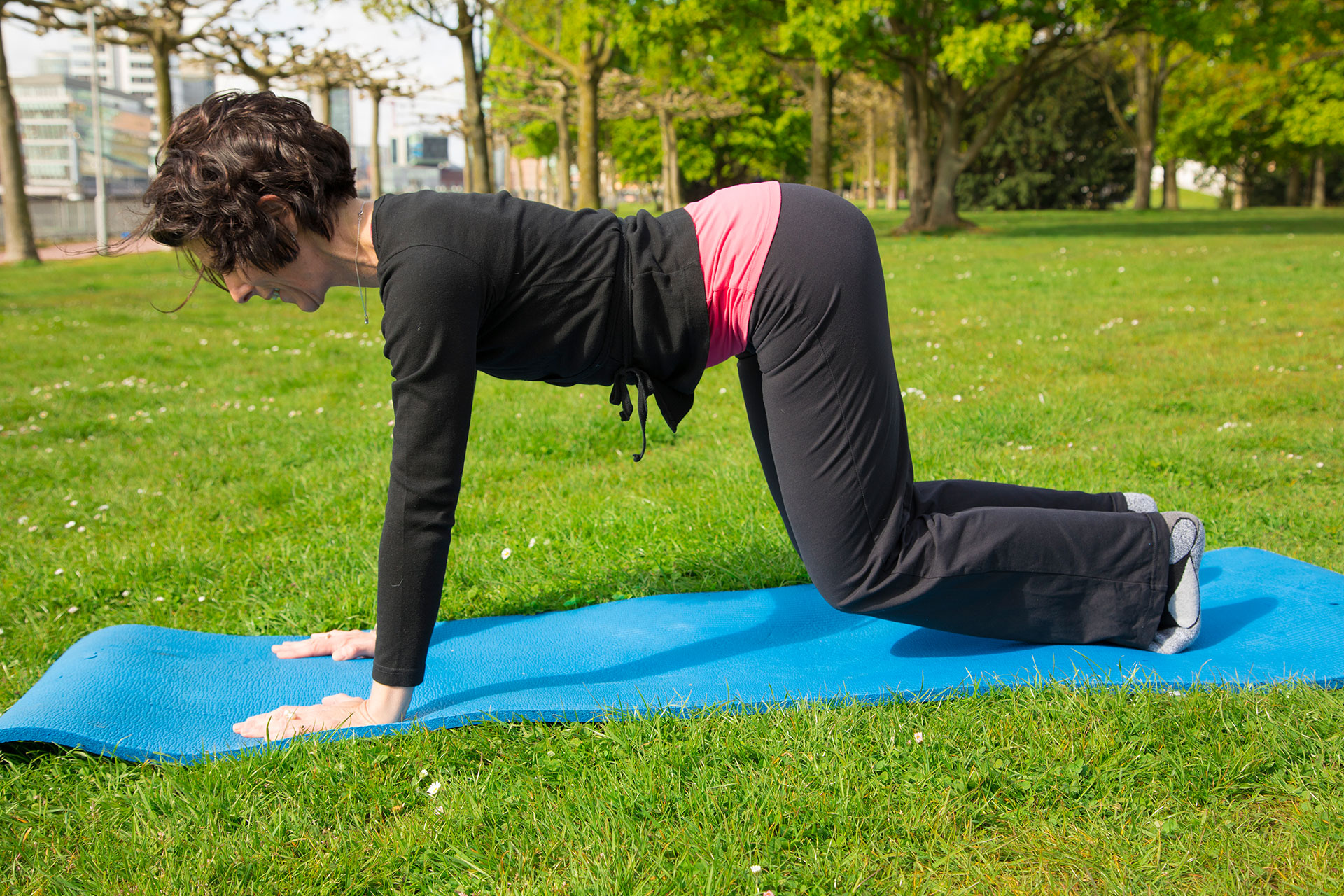 Für die heutige Übung benötigen Sie eine Matte, eine Decke oder ein großes gefaltetes Badehandtuch, damit die Knie ein wenig geschützt sind. Knien Sie sich nun hin und platzieren sie die Hände unterhalb der Schulter. Achten Sie auf einen geraden Rücken und öffnen Sie die Knie beckenbreit. Ganz wichtig bei der Übung: Schauen Sie immer auf die Matte. Ziehen den Kopf weder nach oben, noch lassen Sie ihn nach unten fallen – beides ist nicht gut für die Halswirbelsäule.