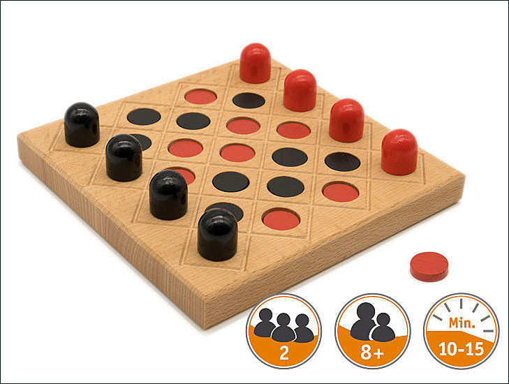 Taktikspiel von Moritz Dressler für 2 Personen. Ab 8 Jahre. Dauer 10 bis 15 Min. Maße: 14,5 x 14,5 cm, Buche massiv geölt. Je 4 Spielsteine und je 9 Scheiben in schwarz und rot.