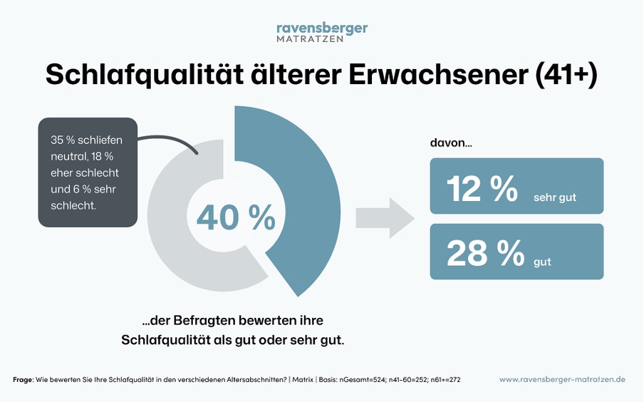 Im Laufe des Lebens verändert sich unser Schlaf grundlegend und das zeigt sich deutlich ab dem mittleren Alter. Laut einer aktuellen Schlafstudie von 2025 sinkt die subjektive Schlafqualität bereits ab dem 41. Lebensjahr. Nur noch 40 % der Befragten zwischen 41 und 60 Jahren geben an, in dieser Lebensphase gut oder sehr gut geschlafen zu haben.