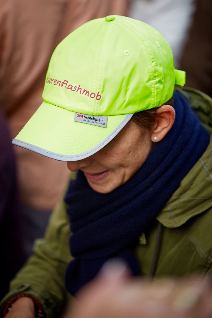 Gesagt, getan. Es wurde recherchiert und recht schnell war sie gefunden – unsere neongelbe, wasserabweisende Multifunktionskappe mit dem Schriftzug “Seniorenflashmob”. Doch was dann folgte hatten wir nicht wirklich erwartet: Während der Veranstaltung wurden wir immer wieder gefragt, wo man denn diese Kappe kaufen könnte. Immer wieder mussten wir den Tänzern und Teilnehmern sagen, dass diese nur für das Organisationsteam gedacht sei und wir diese nicht zum Kauf anbieten.